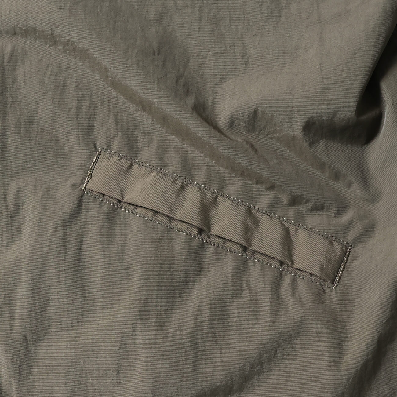 表側はナイロン素材を活かした軽やかな単色仕様。オリーブやブラックといった定番のミリタリーカラーも、マットな光沢とシャリ感のある質感で、重たくなりすぎず程よく都会的。ワークにもストリートにも寄せられる絶妙なバランスが魅力。
