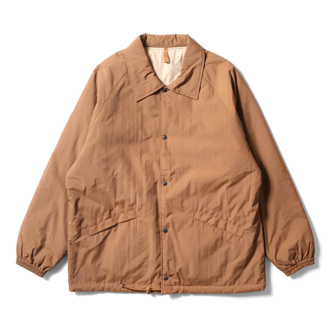 一般的なコーチジャケットは中綿なしのペラっとした作りが多いが、このモデルは中綿入り仕様。程よく膨らみが出ることで、スタイリング全体に立体感と抜け感をプラスしてくれる。
