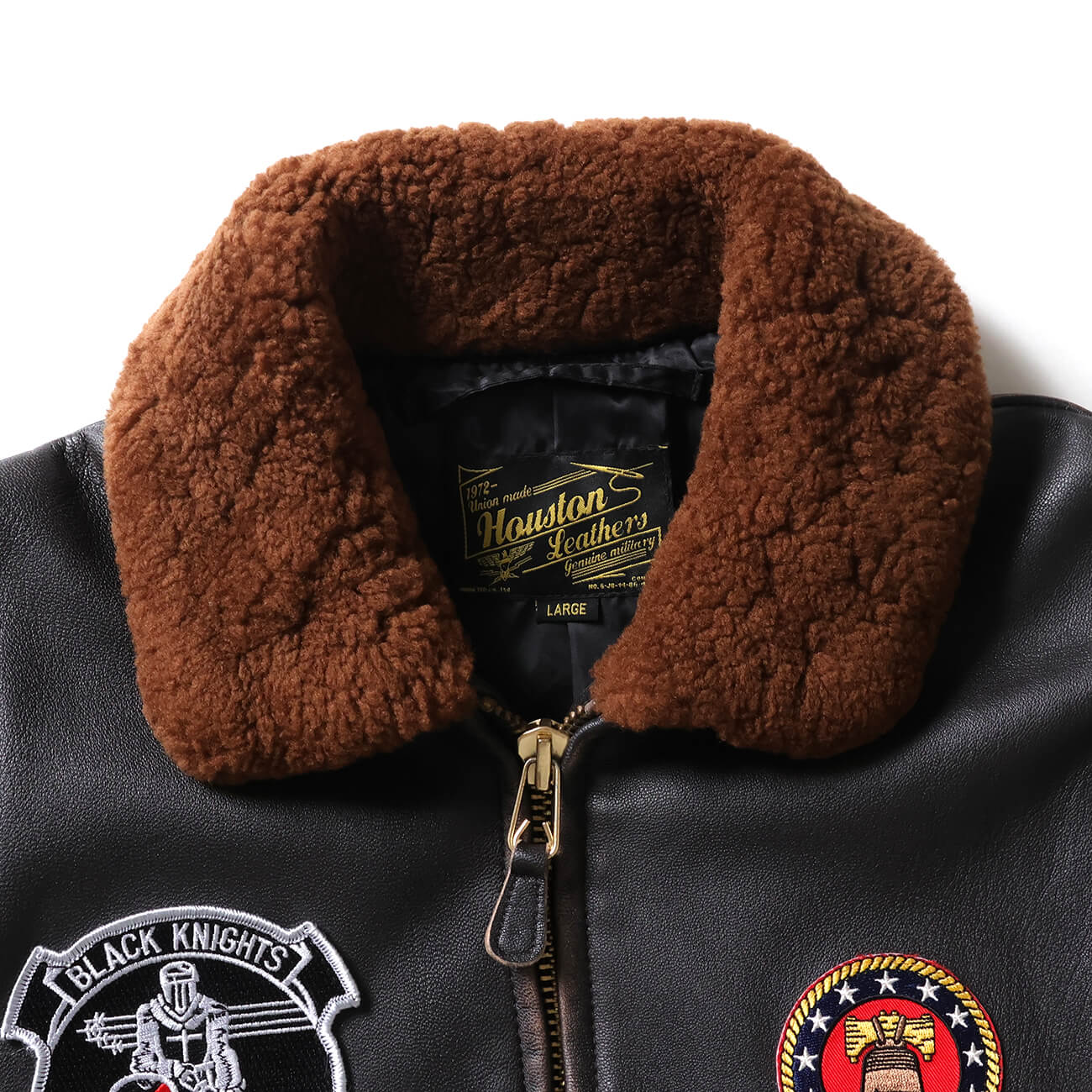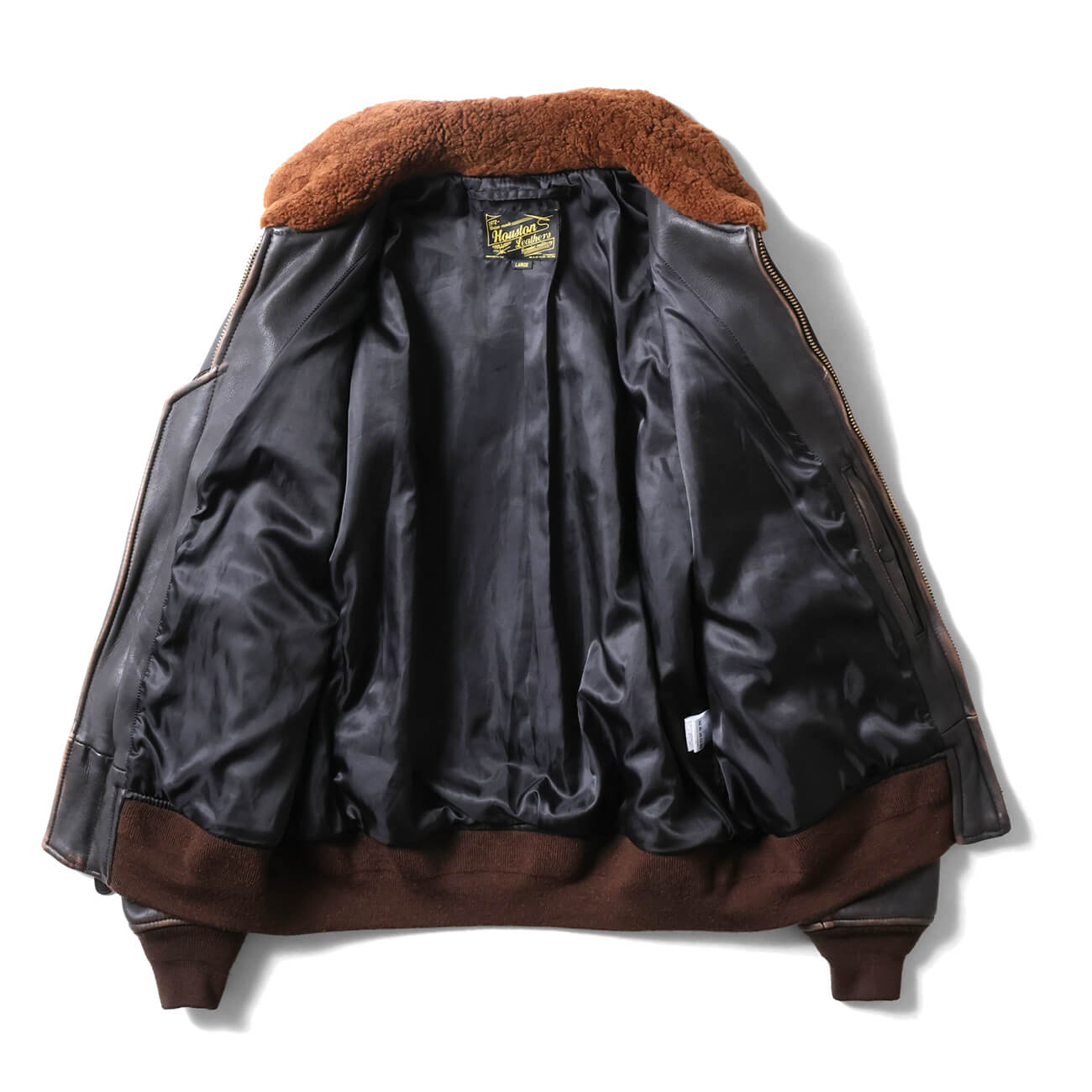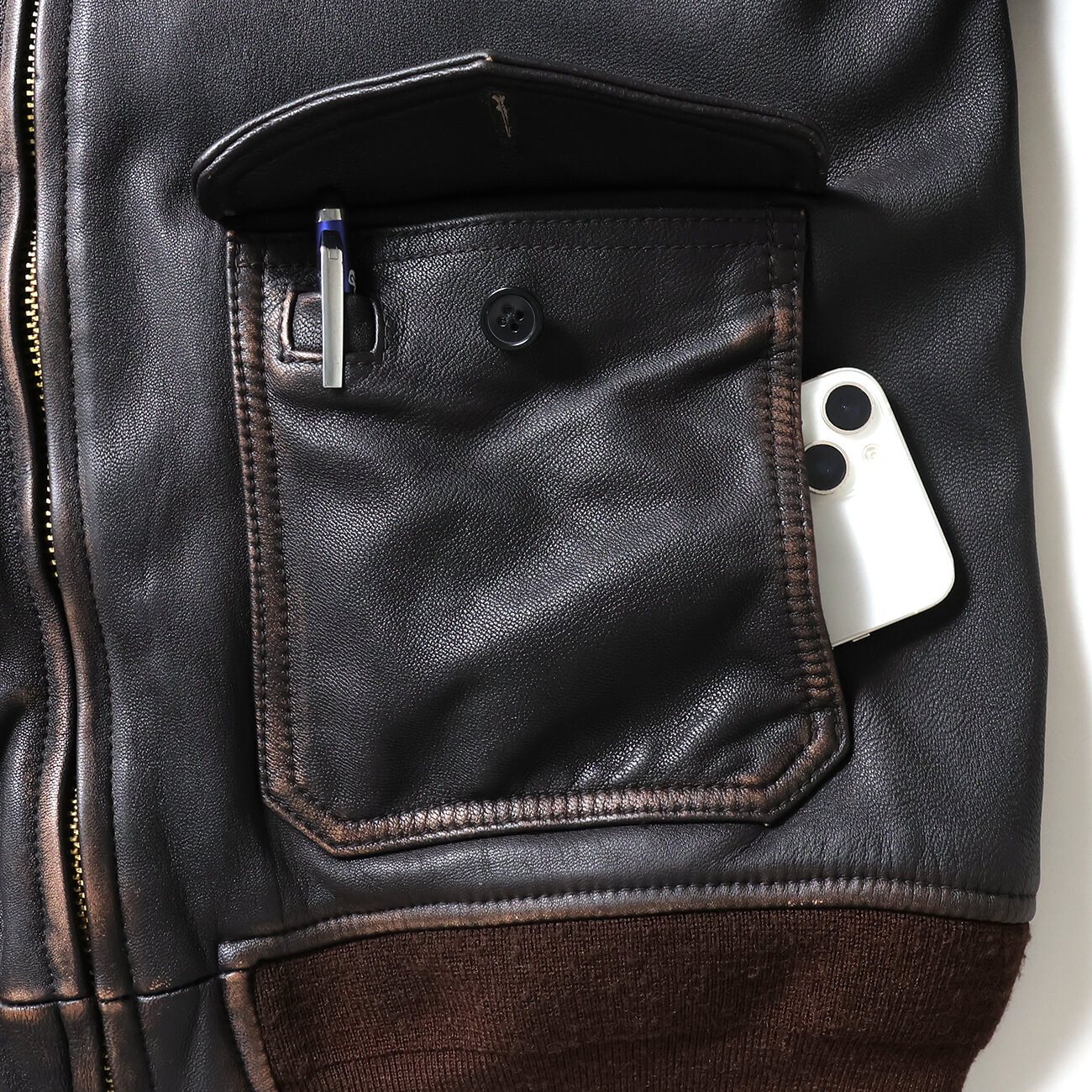 G-1は1947年にアメリカ海軍航空隊の制式フライトジャケットとして採用された。山羊革(ゴートスキン)をベースにしたリブ付きの短丈シルエット、襟のシープムートンなどが特徴。艦載機パイロットが海上の任務で着用するため、防寒性と機動性を両立させた設計となっている。