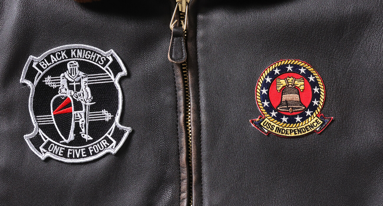「BLACK KNIGHTS(VF-154)」のスコードロンパッチをはじめ、USS INDEPENDENCEなど当時を象徴する刺繍ワッペンを多数配置。