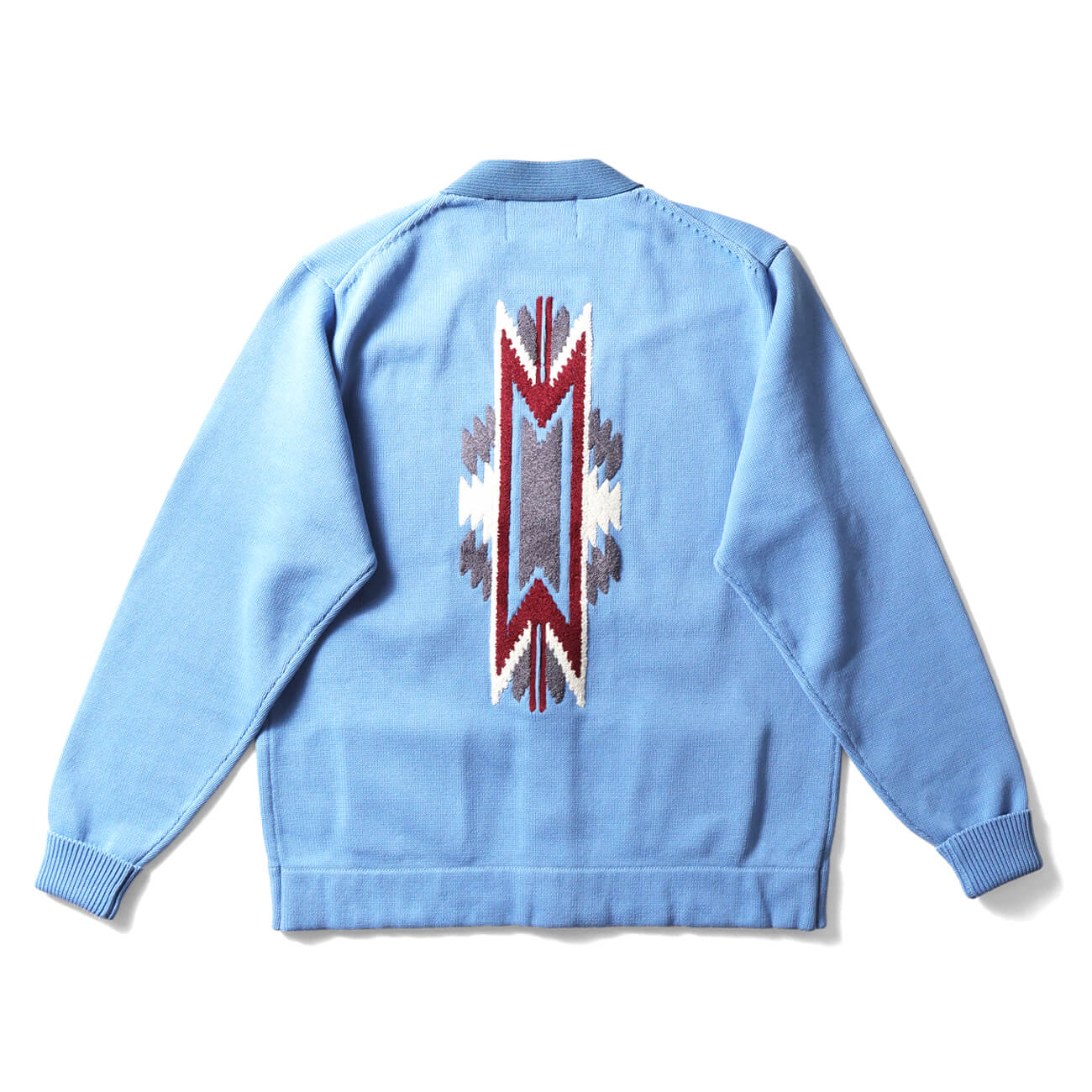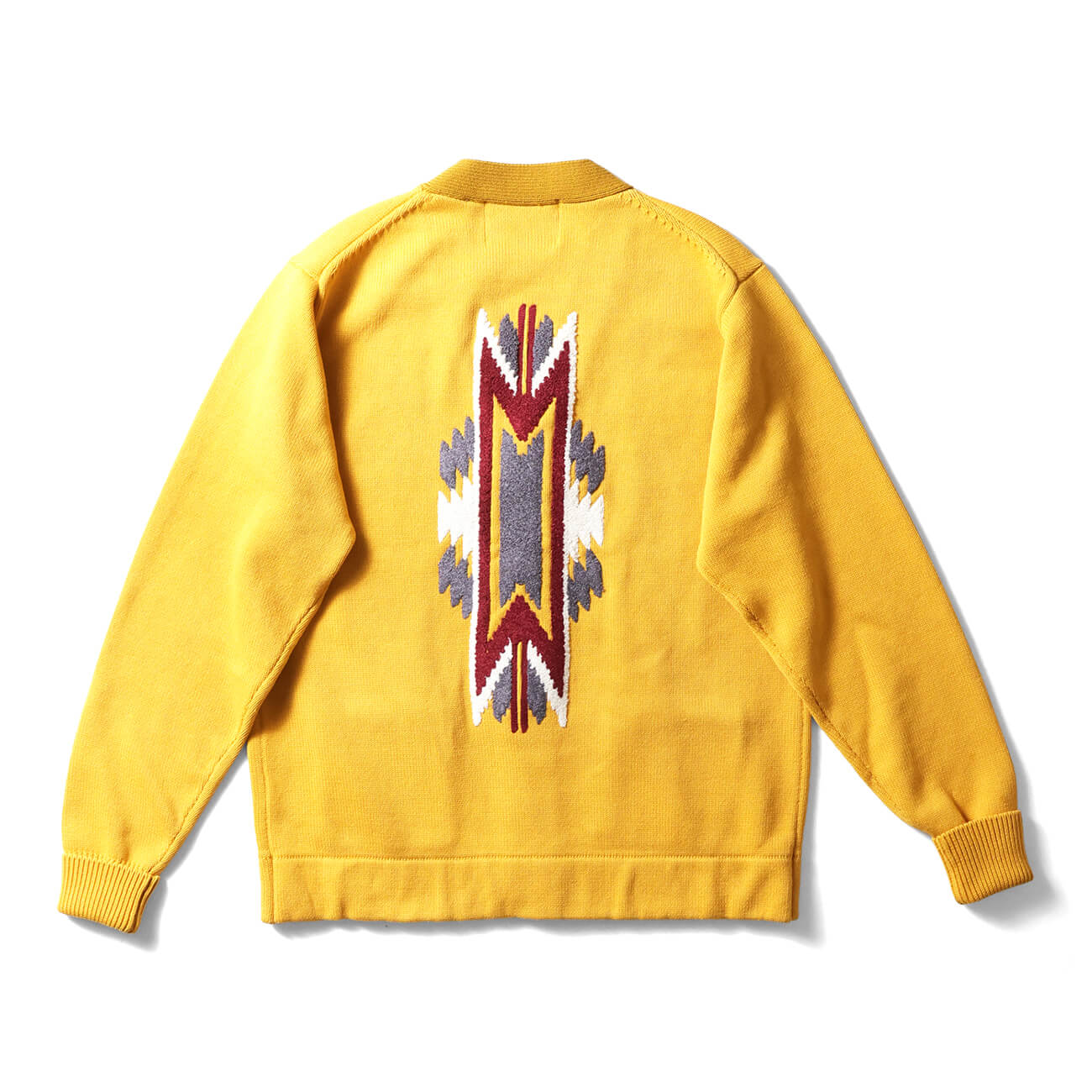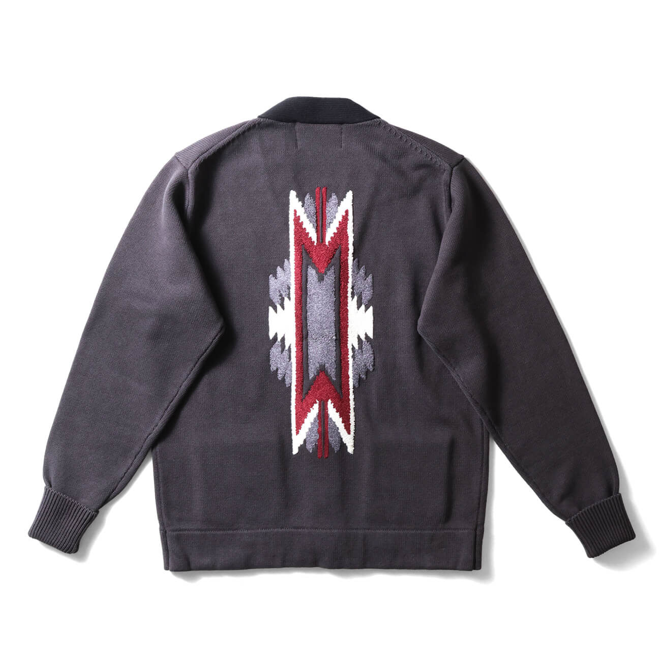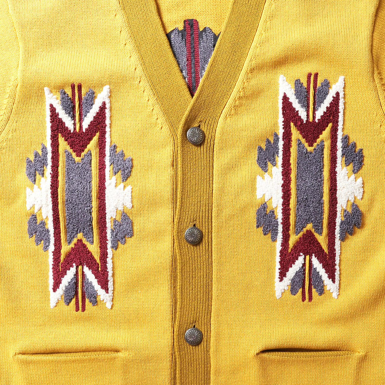 適度に開いたVゾーンがネイティブ柄を美しく見せる構造。前立てリブの編み地切り替えが立体感を生み、カーディガン全体の印象を引き締める。