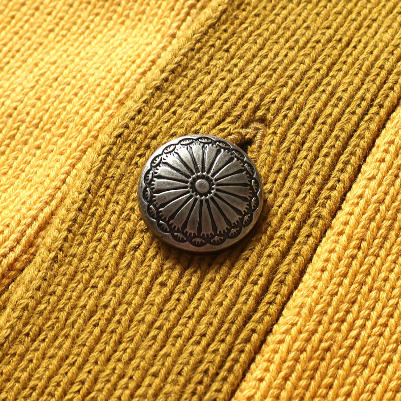 ウエスタンテイスト漂うコンチョデザインのボタンを採用。ニットの質感にメタルの重厚感が加わり、アメカジらしいアクセントとして機能する。
