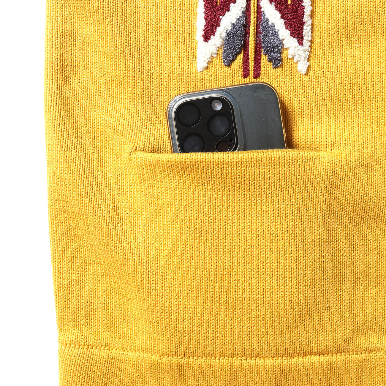 左右に備えたポケットは、スマートフォンや小物の収納に便利。刺繍の存在感を損なわないよう、さりげない配置と仕立てに。