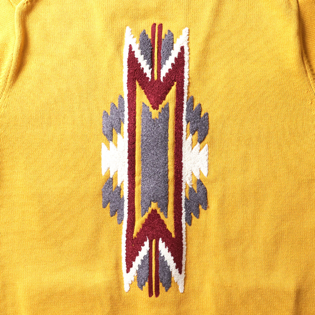アメリカ南西部の伝統柄“チマヨ”を、ニットの上にチェーン刺繍でのせた一着。