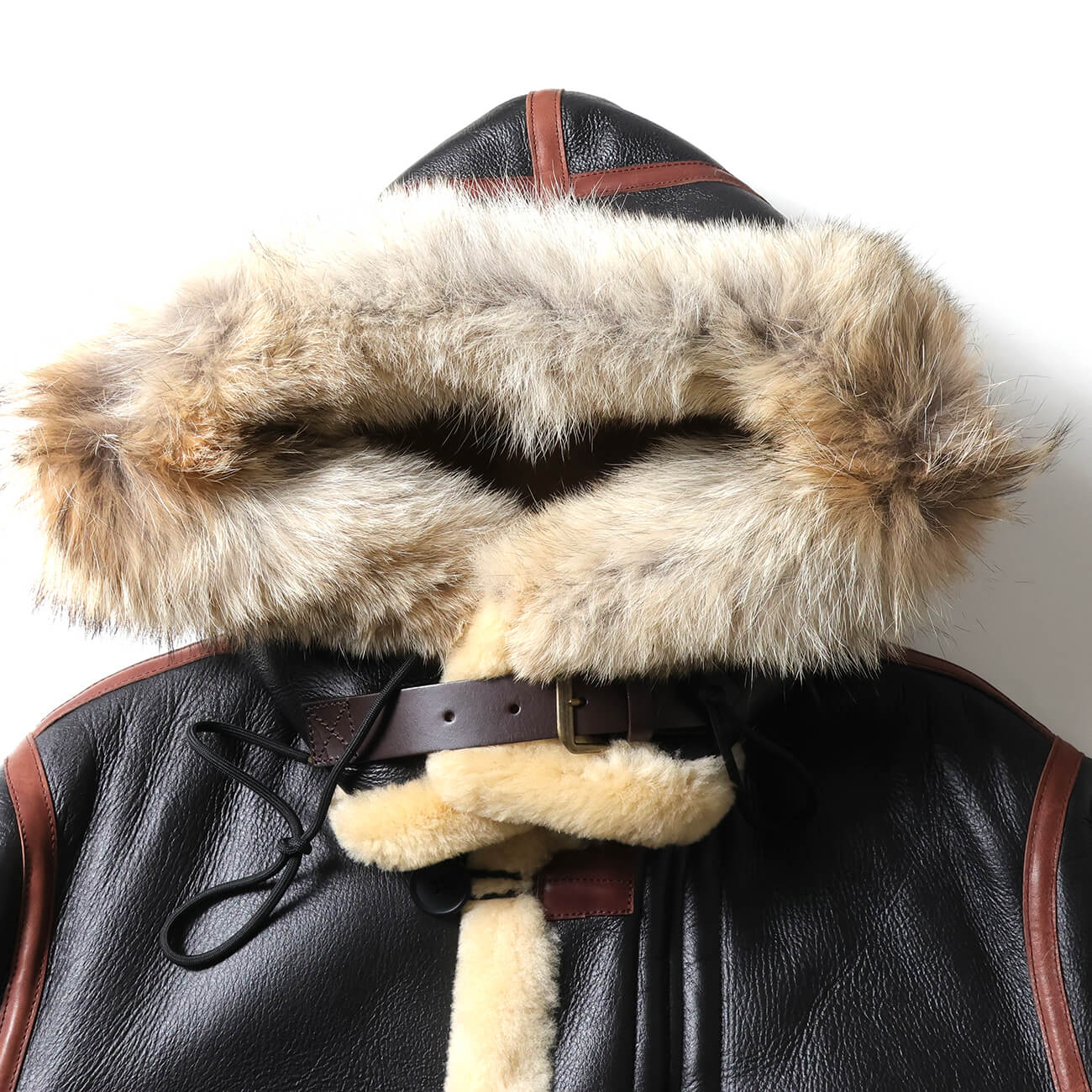 全身を覆う厚手のシープシアリング(ムートン)に加え、大型フードやチンストラップ、レザーパーツで補強された堅牢な構造は、まさに“極地用戦闘服”と呼ぶにふさわしい。