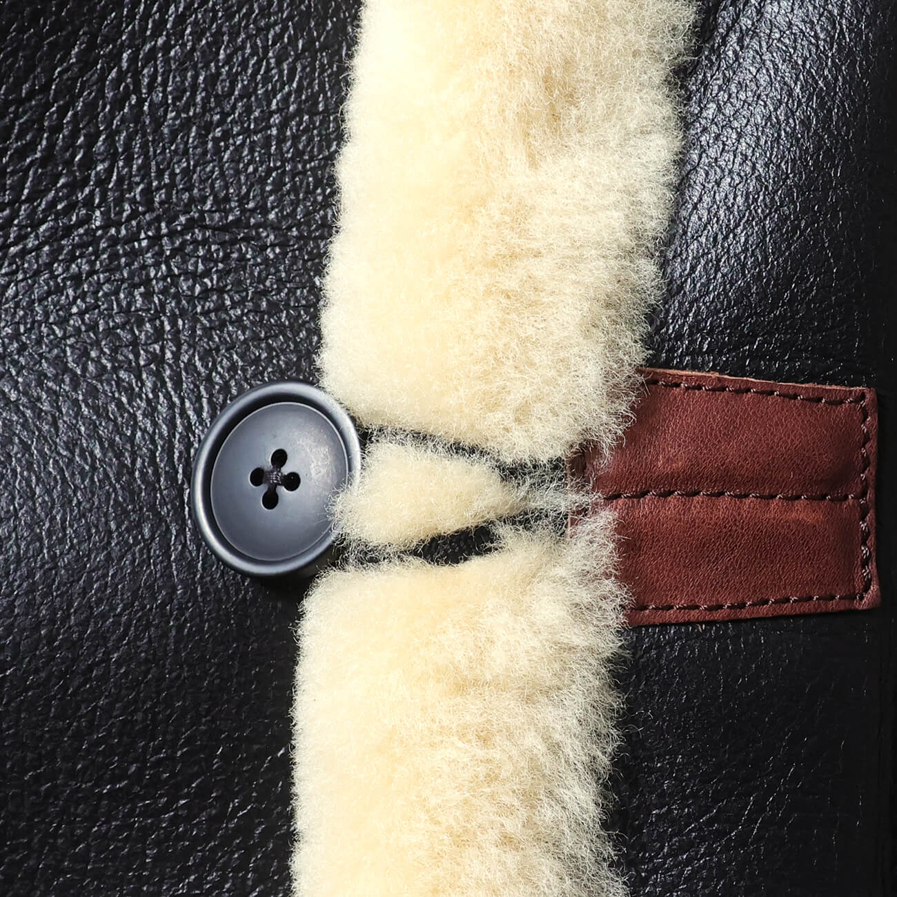 前立てには極厚のムートンを贅沢に使用。ボタンを留めた際の気密性が高く、冷気の侵入を徹底的に抑える。ループ留めの素朴な仕様もB-7らしい表情。