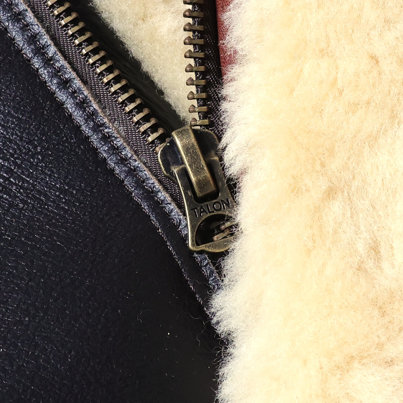 ジッパーにはヴィンテージ愛好家に支持されるTALON製を採用。前立てからのムートンがのぞくコントラストが美しく、機能も意匠も兼ね備えた象徴的ディテール。