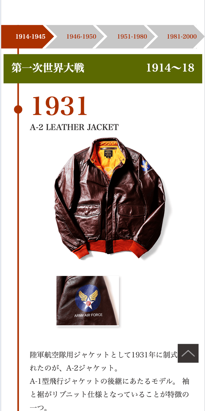 アイテム別ではなく、年代別にミリタリーウエアが並び、古い年代から新しい年代へ、縦スクロールで自然に歴史を辿ることができる。