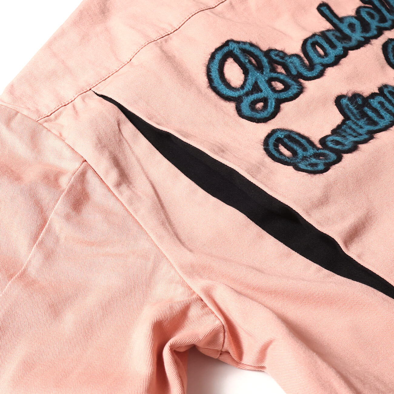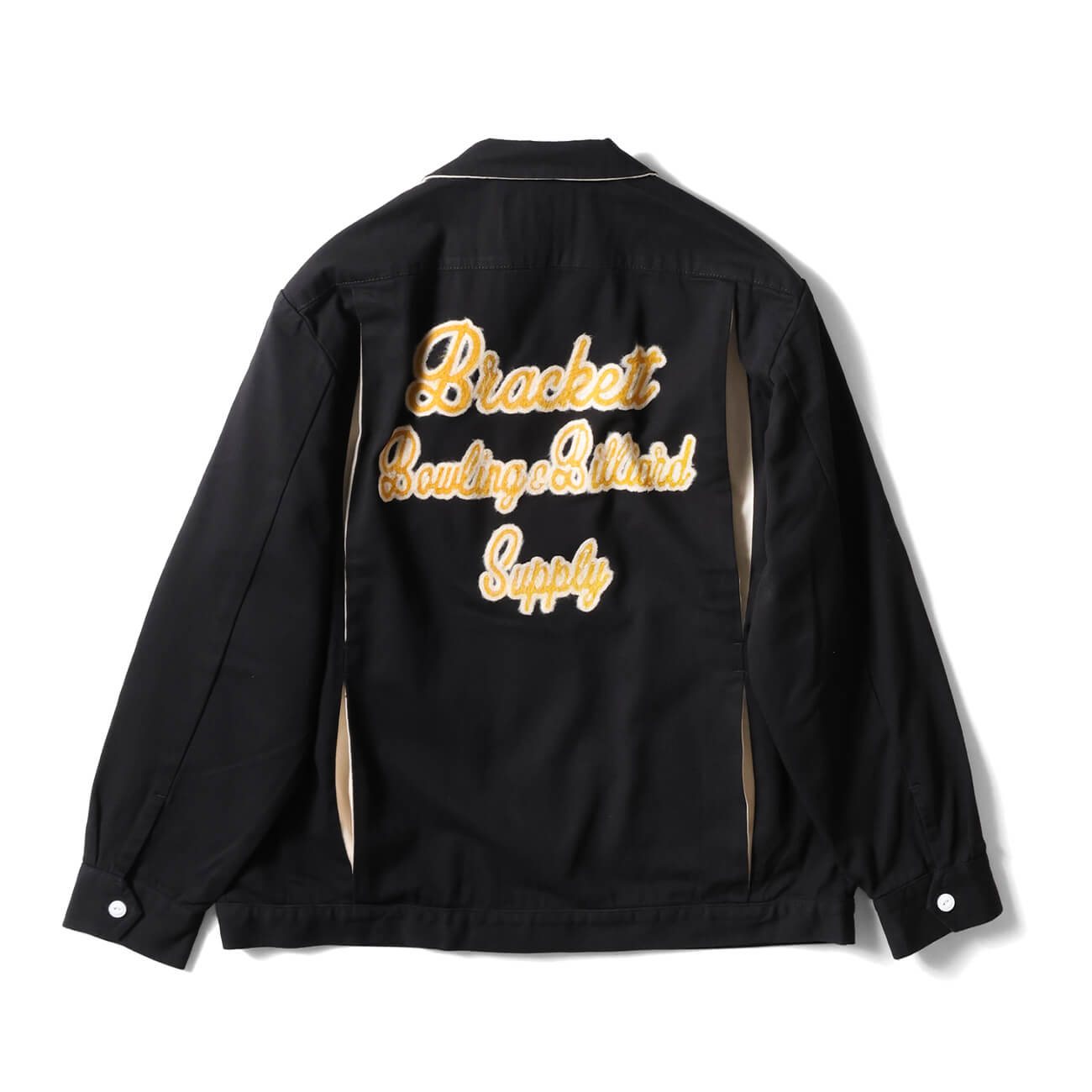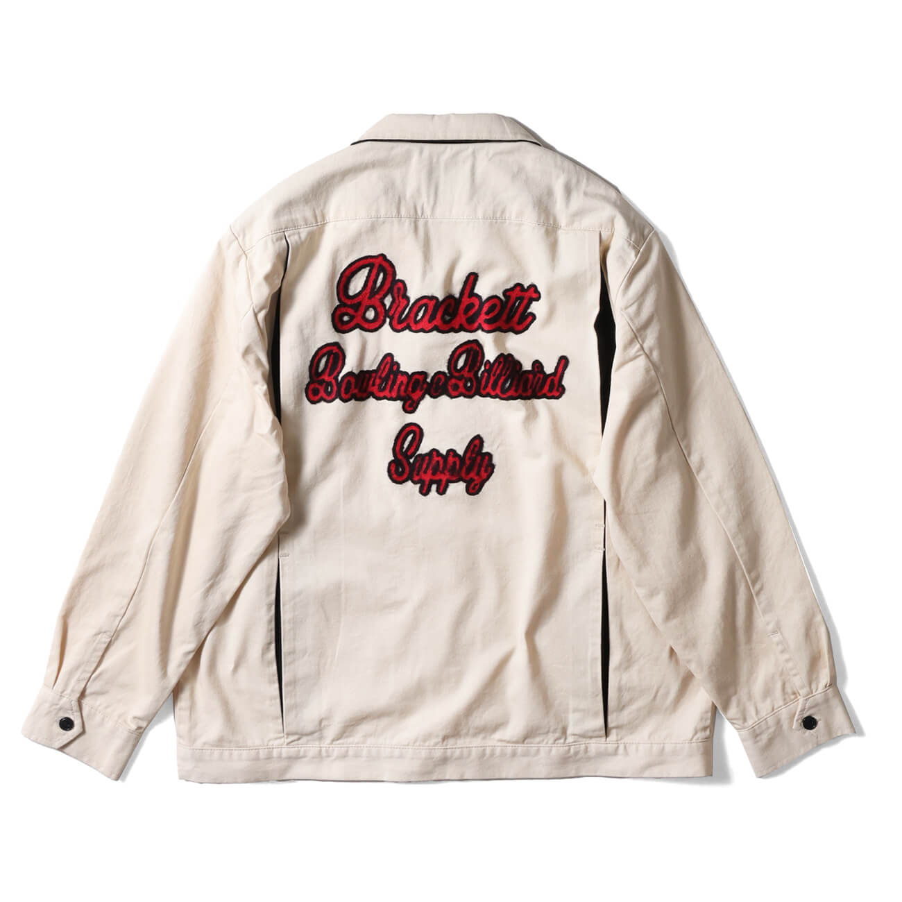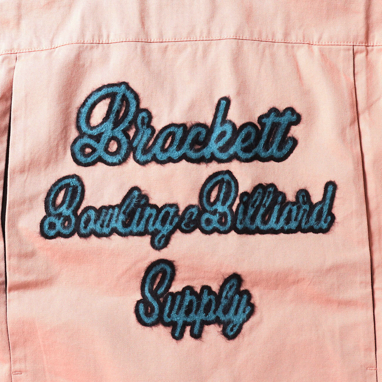 背面には大胆なチェーンステッチ風刺繍を配置。「Bracket Bowling & Billiard Supply」のレタリングが、50sアメリカンカルチャーを想起させる。存在感がありながらも、配色のバランスによって上品にまとまっている。