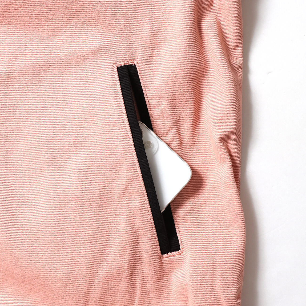 両サイドにはスラッシュポケットを配置。スマートフォンなどの収納にも適した実用的な設計で、ジャケットとしての使い勝手も考慮されている。