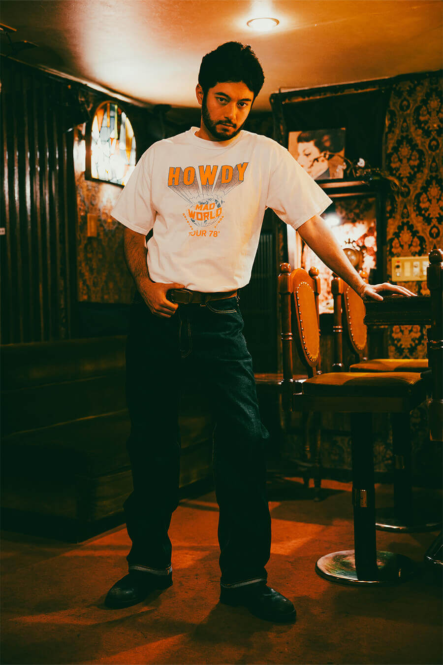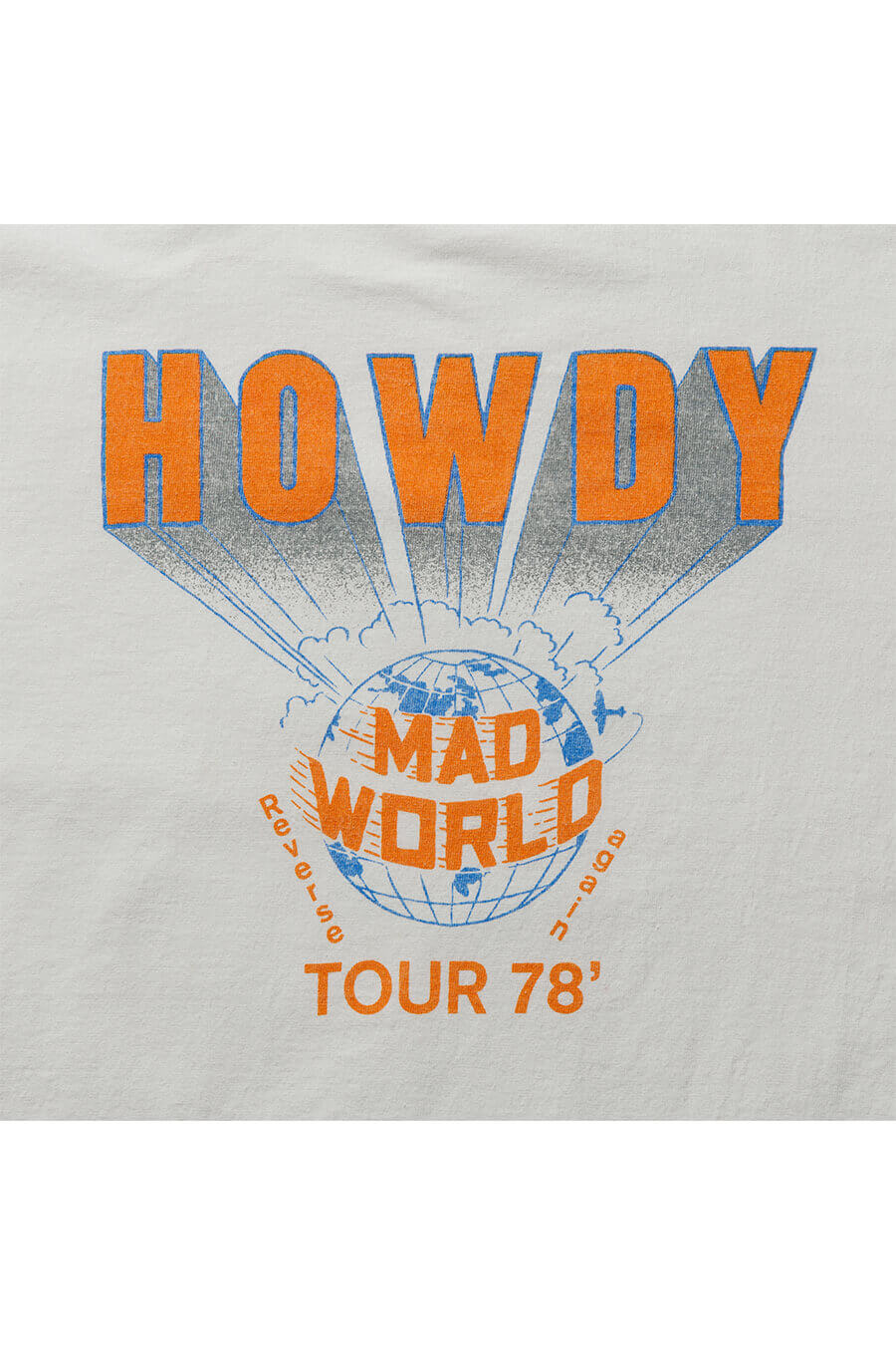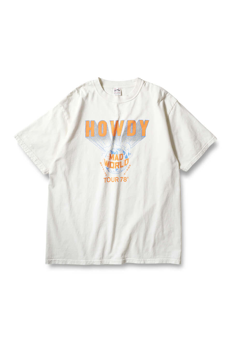 交織りで編み立てた17番単糸のオリジナル生地を使用し、ピグメントバイオ加工でこなれた風合いを表現。着始めから古着のような味わいを楽しめる。70年代ツアーTEEを思わせるユーモアあるメッセージプリントが、ラフなスタイルに絶妙にフィット。丸胴ボディで肌当たりも快適。ホワイト、マスタード、ブラウン、ネイビーの4色を展開。