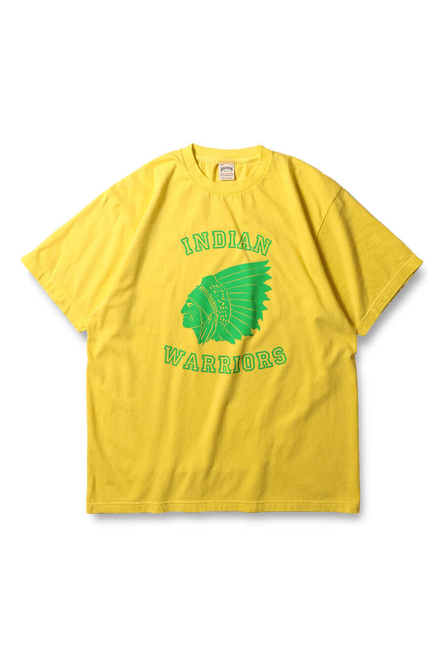 5.6オンスのコットンボディをピグメント染めし、自然な色ムラと奥行きを演出。インディアンモチーフのグラフィックがシンプルな装いにアクセントを加える。薄めのラバープリントが主張しすぎず、デイリーに取り入れやすい一枚。洗い込むほどに風合いが増す。グリーン、イエロー、ブラックの3色を展開。