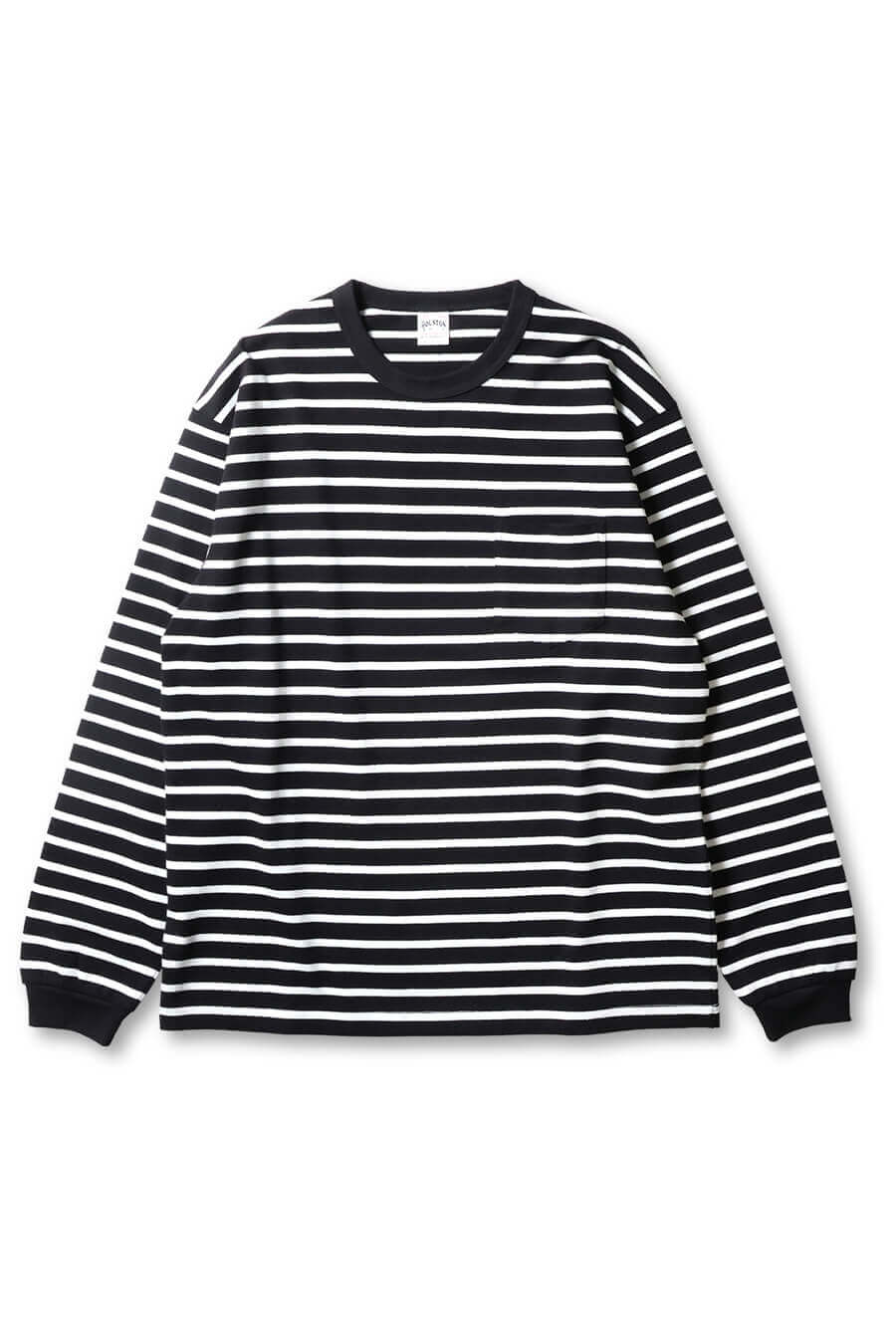 8オンスのヘビーボーダー天竺を使用し、しっかりとした厚みとタフな仕上がりの長袖Tシャツ。先染めボーダーの発色が鮮やかで、定番色に加え90年代を思わせるポップな配色も魅力。胸ポケット付きで実用性も高く、一枚でもインナーでも活躍する。パープル、グリーン、ネイビー、ブラックの4色を展開。